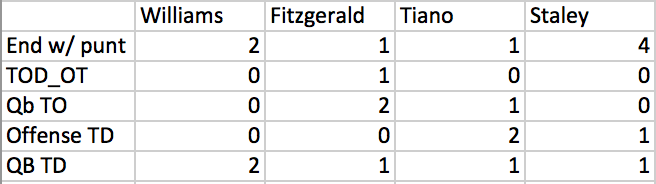 The categories and point values are as follows: 1) punting which is multiplied by -0.5. It’s not the worst way to end a drive but it’s not great either. 2) Turnover on downs or offensive turnover, multiplied by -1. This is more to see how efficient the offense was, not necessarily the quarterback. 3) Quarterback turnover, multiplied by -2. It’s not good for a quarterback to turn the ball over. 4) Offensive touchdowns, multiplied by 1. This is pretty self explanatory, right? An offense scores, it’s efficient. And finally 5) quarterback specific touchdowns, multiplied by 2. Quarterbacks are rewarded here with a higher point total because they were responsible in some manner for the touchdown, be it by passing, running, or catching in a trick play.