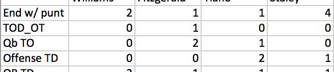 Pretty easy to understand everything so far, right? Damian Williams had a 50/50 split of how his drives ended while the other guys had more variation in their results. And now, we’re going to start doing some multiplication from our set of raw data to start compiling the efficiency data.
