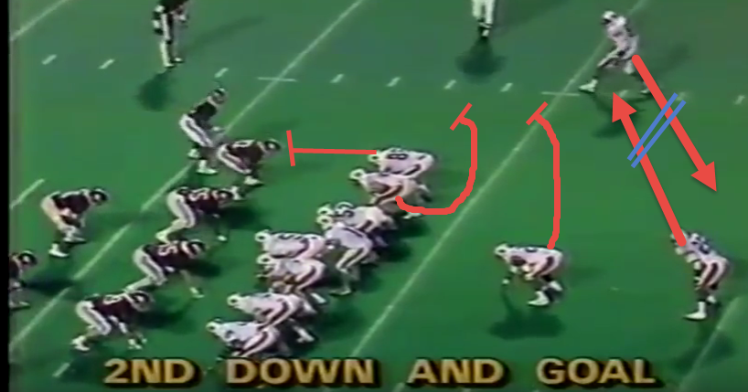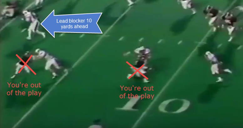 The lead blocker indicated is Walter Reeves. There’s a reason Pat Dye thought Reeves was the greatest tight end in the history of football, and it wasn’t necessarily his hands. Reeves has managed to mock-seal the edge to the right, slip his man, and filter left and down to the goal line. He has two defenders just out of this frame. He reaches to block the furthest man, forcing the other defender to go around him in order to get to Tillman.