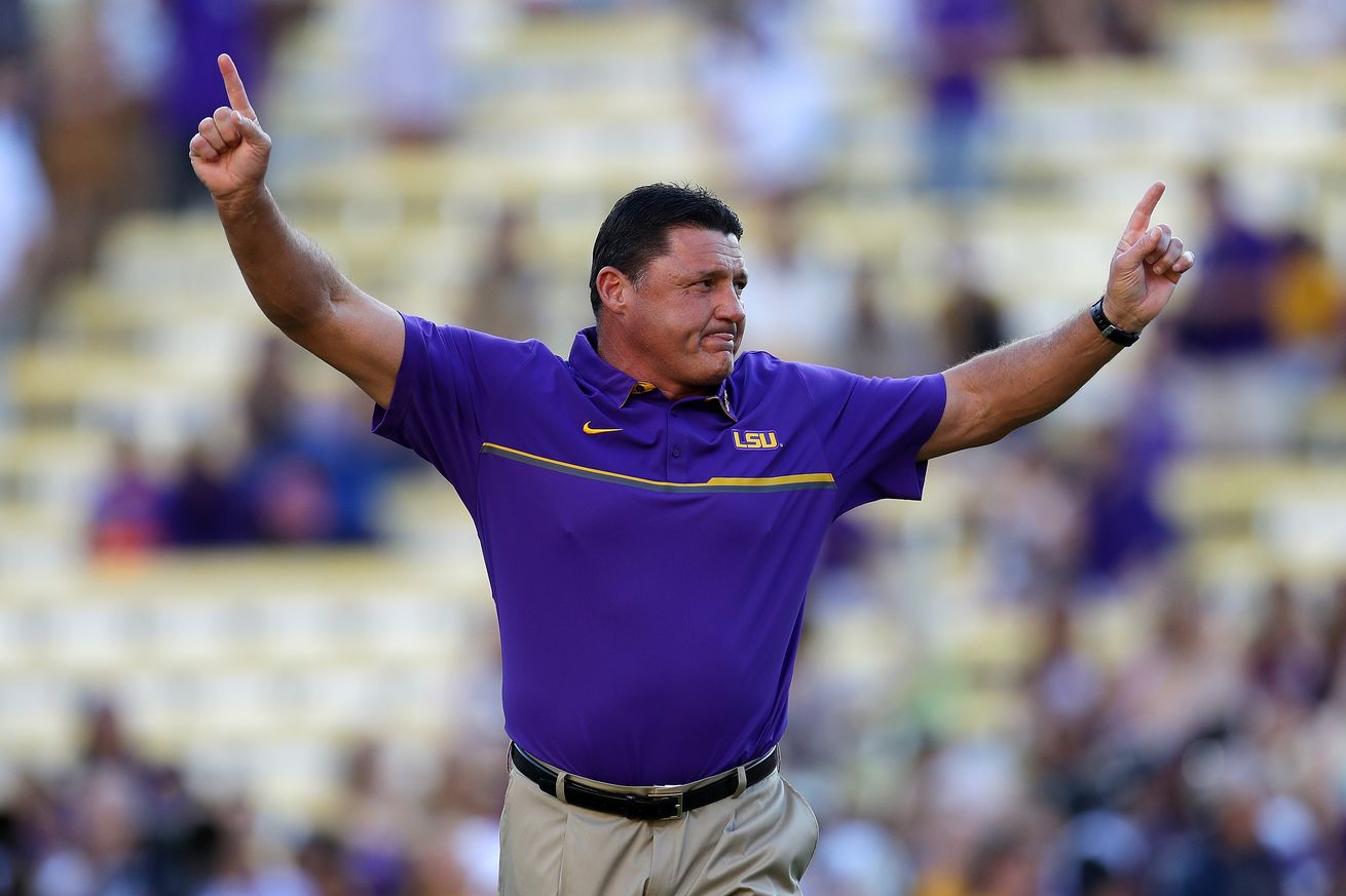 On the field, Ed Orgeron was just fishing with his interview requests and saying hello to recruits, things a coach generally does after a home game. As he jogged off the field at the exact moment the song reached his apex, Orgeron thrust his arms in the air and jogged out of sight into the tunnel. It was an ending lifted from The Breakfast Club, only somehow made better by timing and raw emotion. We’re kind of force fed those kind of moments by movies to the point that most of us roll our eyes when it happens on screen, but when something like that happens in real life, we usually don’t know how to react to it.
