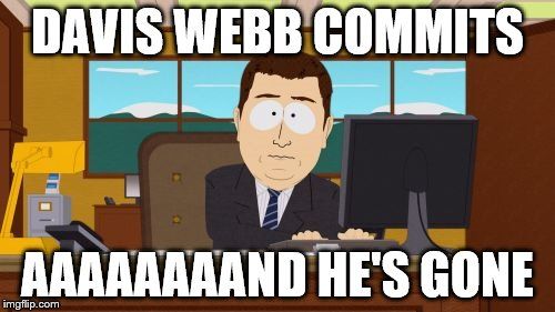 *sigh* This means I have to talk about Davis Webb now, right? Ugh. Well, we were all very excited about Webb here at Ralphie Report. A senior QB who’s won a bowl game and helps Sefo recover from his injury? Fits the offense we are trying to install to a tee? Great news! Nice job recruiting by the staff! Wait… he’s visiting Cal? Maybe he just wants a free trip to the beach. He’s still committed here officially. Spavital probably just wanted to touch base with him? Davis was so pro Buffs before, no way he backs out. Cal is reporting he committed?! What? No way. False alarm, false alarm… But he is following a lot of Cal players on Twitter. He’s certainly considering them. We’ll hear more after he’s done with Finals.
