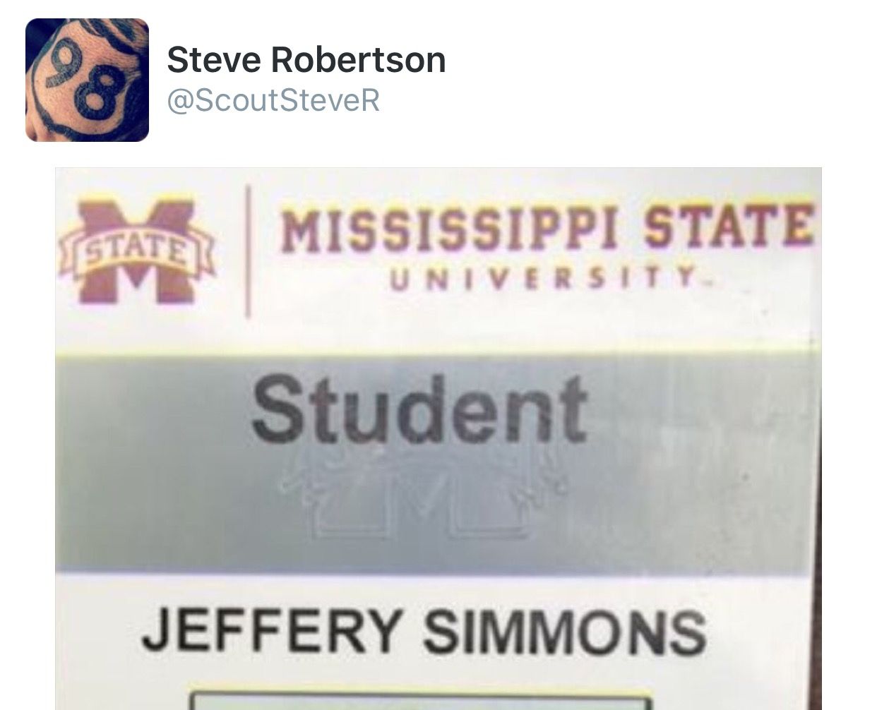 Steve Robertson of scout.com had posted a tweet with a picture of Jeffery Simmons’ Mississippi State student ID, but the photo and tweet were taken down rather quickly. I was able to get a screenshot of the tweet and the picture, and I cropped it to remove the potential of seeing any of Simmons’ personal information that may have been on it.