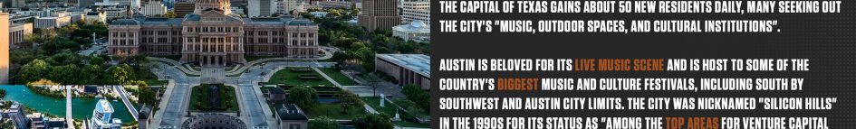 Austin is beloved for its live music scene and is host to some of the country’s biggest music and culture festivals, including South by Southwest and Austin City Limits. The city was nicknamed “Silicon Hills” in the 1990s for its status as “among the top areas for venture capital investment in the country.”