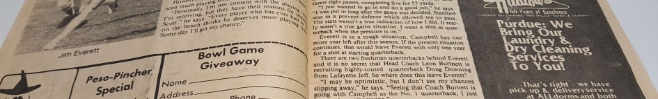 As it turns out, this magazine was dated from October 16, 1982. It comes just after a 38-34 loss at Illinois that had Purdue starting 0-5 against the likes of Stanford (with some guy named John Elway) Minnesota, Notre dame, Wisconsin, and the Illini. Purdue had an upcoming game against Northwestern, who had actually won two games after breaking their record 36-game losing streak earlier in 1982. Among the highlights: