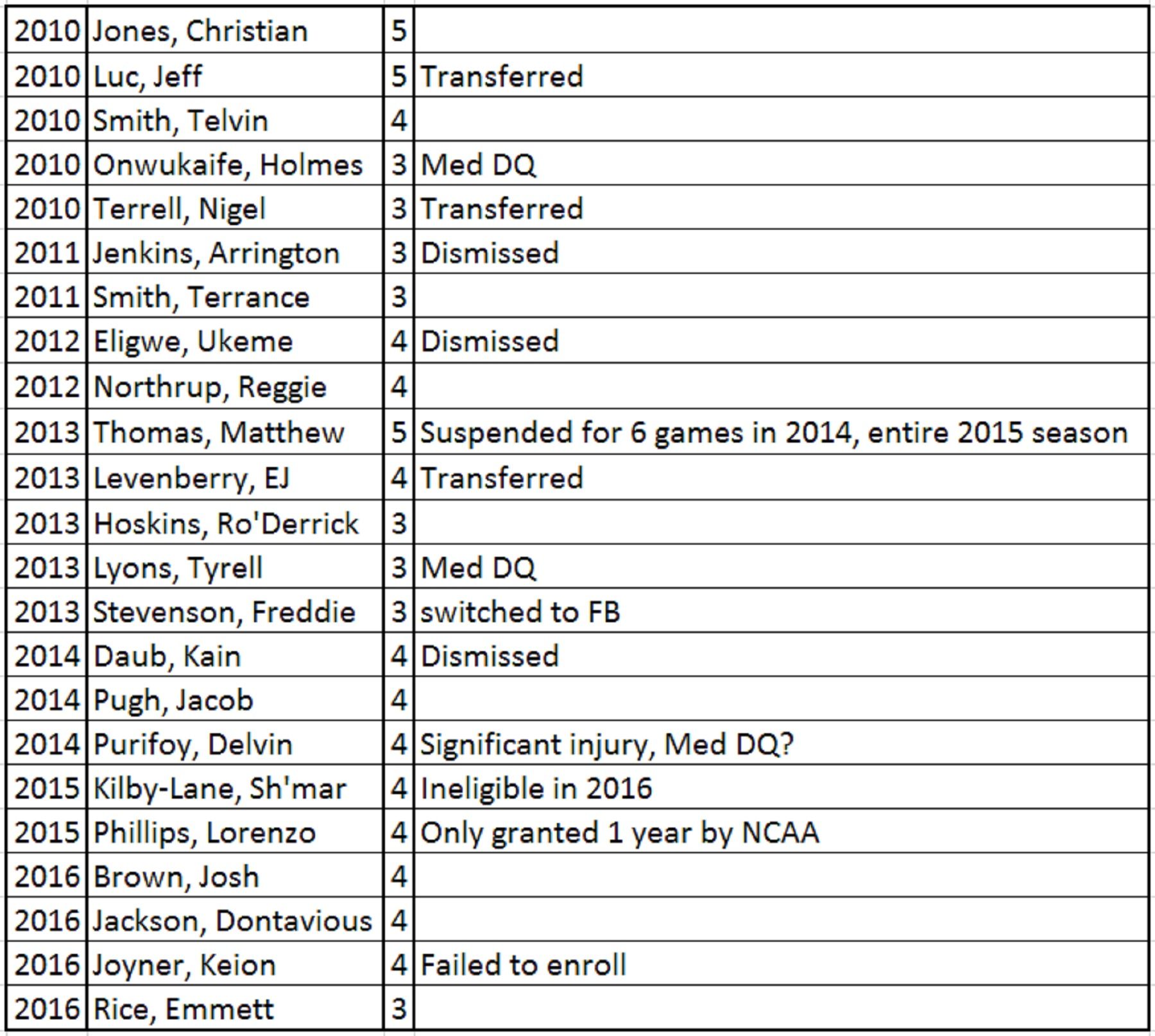 Unfortunately, through either injury, discipline, academics, or transfers, 14 of the 23 prospects signed have encountered some form of impediment preventing them from contributing on the field. We have seen transfers (Jeff Luc and EJ Levenberry), dismissals (Arrington Jenkins, Ukeme Eligwe, and Kain Daub), NCAA interference (Lorenzo Phillips), off-field suspensions (Matthew Thomas and now Sh’Mar Kilby-Lane, the latter for academics), and injuries (Delvin Purifoy and Tyrell Lyons).