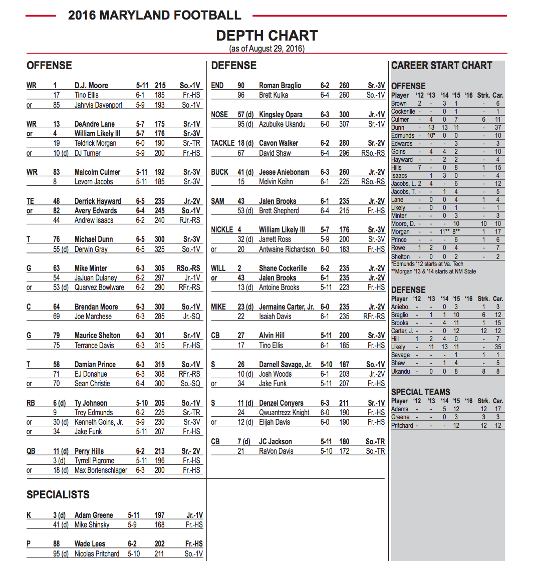 The Maryland football team opens its season this Saturday against Howard, and the team has finally released its first depth chart under new head coach DJ Durkin.