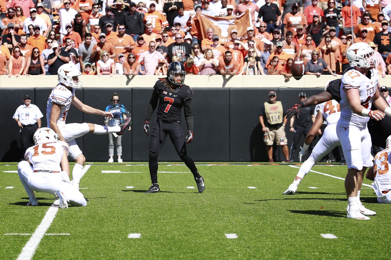 In the first half of the 49-31 loss by the Texas Longhorns to the Oklahoma State Cowboys in Saturday in Stillwater, the Cowboys were able to tie a school record by blocking three point-after attempts by the Longhorns.