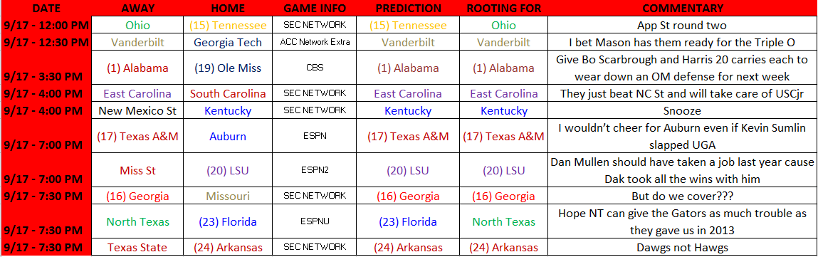 Ok let’s get positive for a minute. God knows we need it. Georgia is 2-0 and may have some slight positives falling into place. Hopefully the Colonels woke Georgia up and we see an inspired performance in Missouri. The tiger faithful seem to be taking the week off as 15,000 tickets are still available. I guess that new SEC smell finally wore off and now we can’t even fill out Faurot Field for a top 25 team. Moving forward, you’ve got to hope 230lb Bo Scarbrough gets 35 carries and wears the Ole Miss defense down this week. A noon start will likely see me only slightly buzzed and could catch the talented Rebels sleeping. Georgia will get an early return home and full rest before a home game against Tennessee who will have just seen one of the SEC’s best defenses in Florida. These are small things, but the parity in college football makes small things huge advantages. Don’t think about Georgia, prepare for Alabama, prepare for Florida and give us the noon kick. Everybody will be shocked when you sneak into Atlanta.