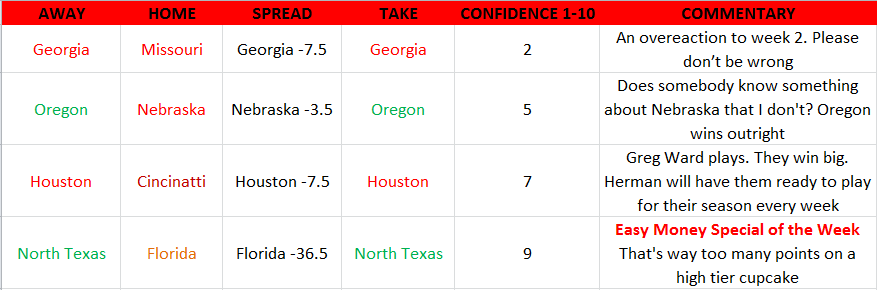 I’m not going to get in depth on Mizzou. I’ll do that next week following a win or loss. Georgia should beat this team as the rosters are not comparable from a talent perspective. This game hinges on scheme, want to and turnovers. It’s the first SEC game on your schedule. Time to get up.